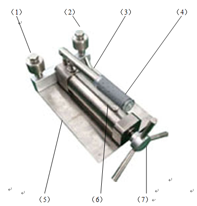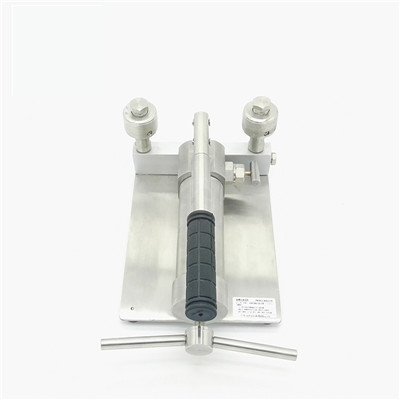 至適當位置(中間位置)。向注液口⑹內(nèi)加入造壓介質(zhì),順時針鎖緊泄壓閥⑶,用手壓泵⑷上下抽打加壓(造壓前要將注液口螺母松開,一般手壓泵打壓40MPa左右,再用微調(diào)細調(diào)至60MPa) 然后再用微調(diào)精細調(diào)節(jié)(微調(diào)順時針旋轉(zhuǎn)為加壓,逆時針旋轉(zhuǎn)為減壓),泄壓時直接打開泄壓閥門即可泄壓。