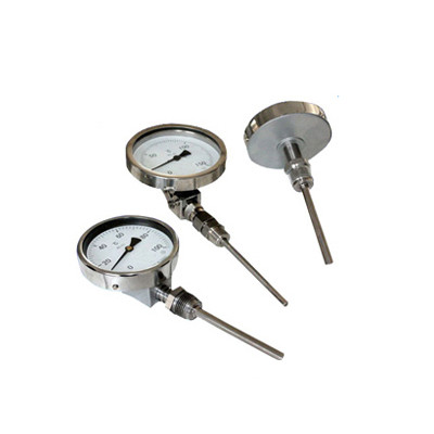 雙金屬溫度計是基于繞制成環(huán)性彎曲狀的雙金屬片組成。一端受熱膨脹時,帶動指針旋轉(zhuǎn),工作儀表便顯示出熱點勢所應(yīng)的溫度值。